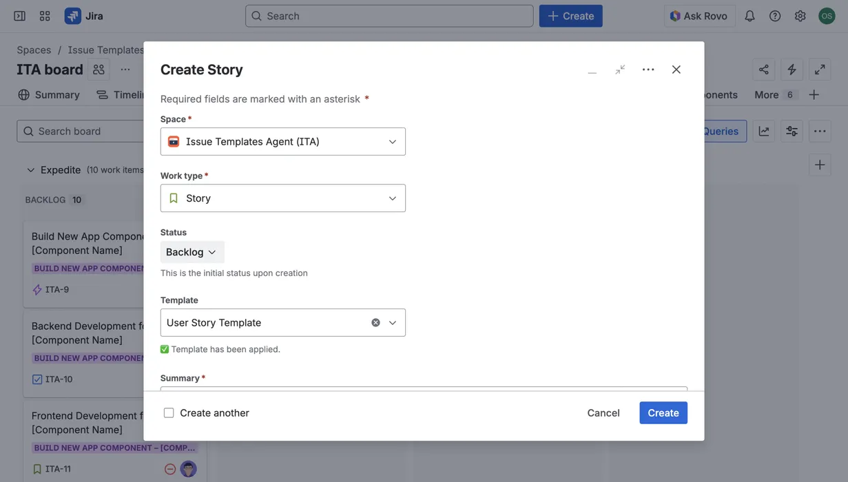 Apply templates directly on the Create screen or when adding child items, streamlining your team's native workflow.